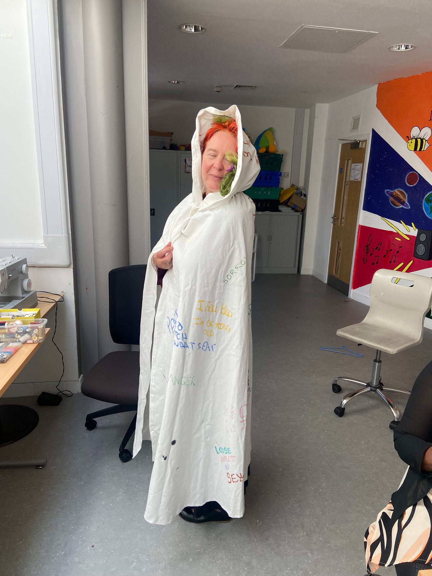 We made sure the cloak was the centre of attention at this session. We interacted with it in all sorts of ways as well as explaining a little of the ‘why’ behind it.